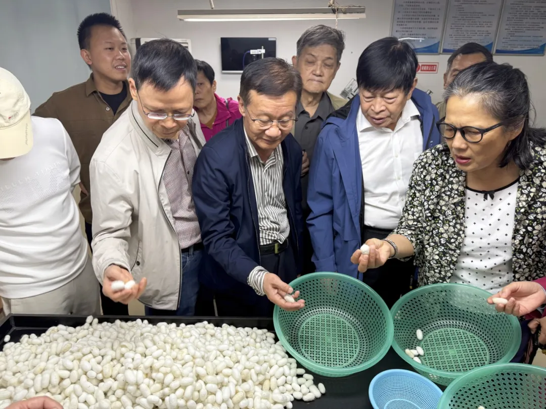 离退休老干部参观河池市纤维检验所选蚕实验室