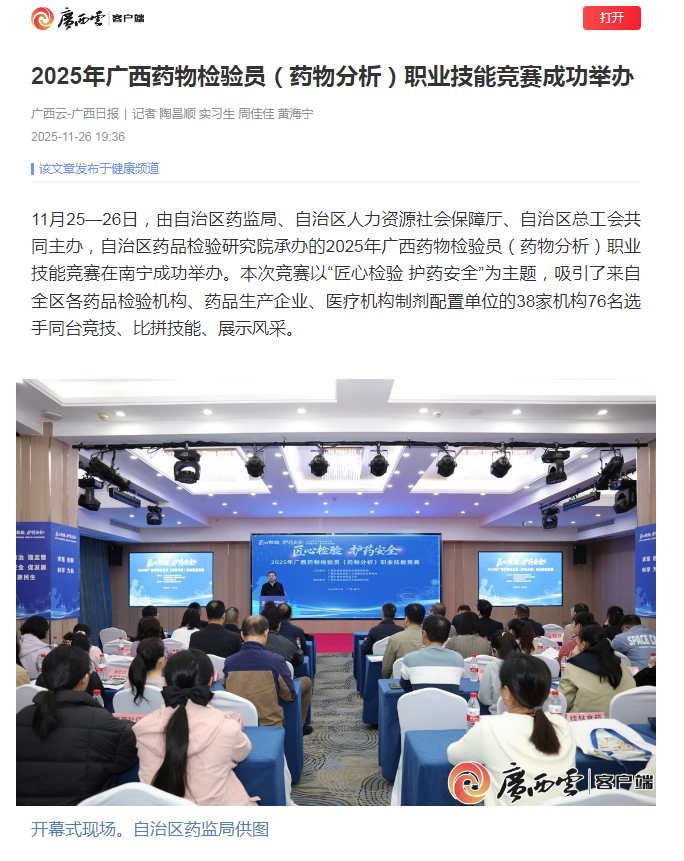 11月25—26日,由AG真人、自治区人力资源社会保障厅、自治区总工会共同主办,自治区药品检验研究院承办的2025年广西药物检验员(药物分析)职业技能竞赛在南宁成功举办。本次竞赛以“匠心检验 护药安全”为主题,吸引了来自全区各药品检验机构、药品生产企业、医疗机构制剂配置单位的38家机构76名选手同台竞技、比拼技能、展示风采。