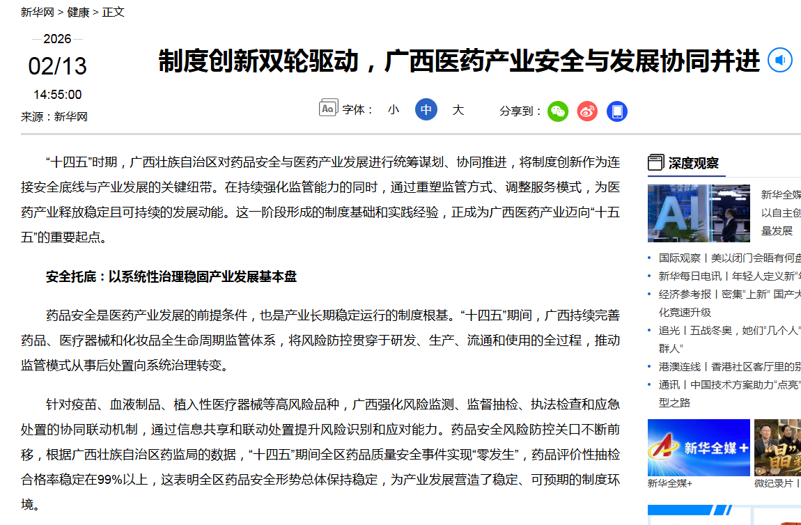 “十四五”时期,广西壮族自治区对药品安全与医药产业发展进行统筹谋划、协同推进,将制度创新作为连接安全底线与产业发展的关键纽带。在持续强化监管能力的同时,通过重塑监管方式、调整服务模式,为医药产业释放稳定且可持续的发展动能。这一阶段形成的制度基础和实践经验,正成为广西医药产业迈向“十五五”的重要起点。