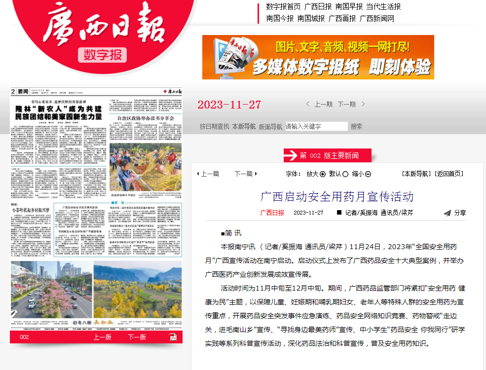 本报南宁讯 (记者/奚振海 通讯员/梁芹)11月24日,2023年“全国安全用药月”广西宣传活动在南宁启动。启动仪式上发布了广西药品安全十大典型案例,并举办广西医药产业创新发展成效宣传展。